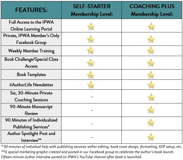IPWA has two membership levels: Self-Starter and Coaching Plus+. Both have access to the members' online learning portal, access to the private members-only Facebook group, weekly training, access to any book challenges Krista offers (current members only), book templates and their instructions, #AuthorLife Newsletter, and the option to become an affiliate. Coaching Plus+ includes six 30-min private coaching sessions, a 90-minute review of their manuscript, quarterly #AuthorLife merchandise sent to their home, an Author Spotlight Post in our Facebook group, and a 15-minute author interview (Zoom) posted on IPWA's YouTube channel.